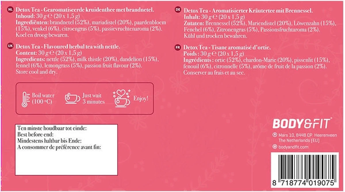 Haak jij ook af bij de woorden sapkuur of vasten? Kies dan voor onze Detox thee. Geen lastige en ingewikkelde sapkuren of vastenperiodes! Geniet dagelijks van de heerlijke Detox thee van Body & Fit. Detoxen is momenteel extreem hot en je ziet allemaal verschillende manieren voorbij komen. Sapkuren, vasten en nog veel meer. De meeste varianten kosten een hoop moeite, tijd, geld en energie. Voor degene die daar geen zin in hebben is er nu onze Detox thee. Zo maak je op een gemakkelijke manier van iedere dag een detox dag! Onze Detox thee is door een speciaal team van thee experts en diëtisten samengesteld voor een optimale samenstelling voor dagelijks gebruik, met uitsluitend natuurlijke ingrediënten. Maar niet alleen de samenstelling is perfect, de smaak is ook nog eens ongekend lekker! De Detox Thee is een unieke samenstelling van brandnetel, mariadistel, paardenbloem, venkel, citroengras en afgemaakt met een heerlijk passievruchtaroma. Mariadistel ondersteunt de reinigende werking van de lever en ondersteunt de spijsvertering