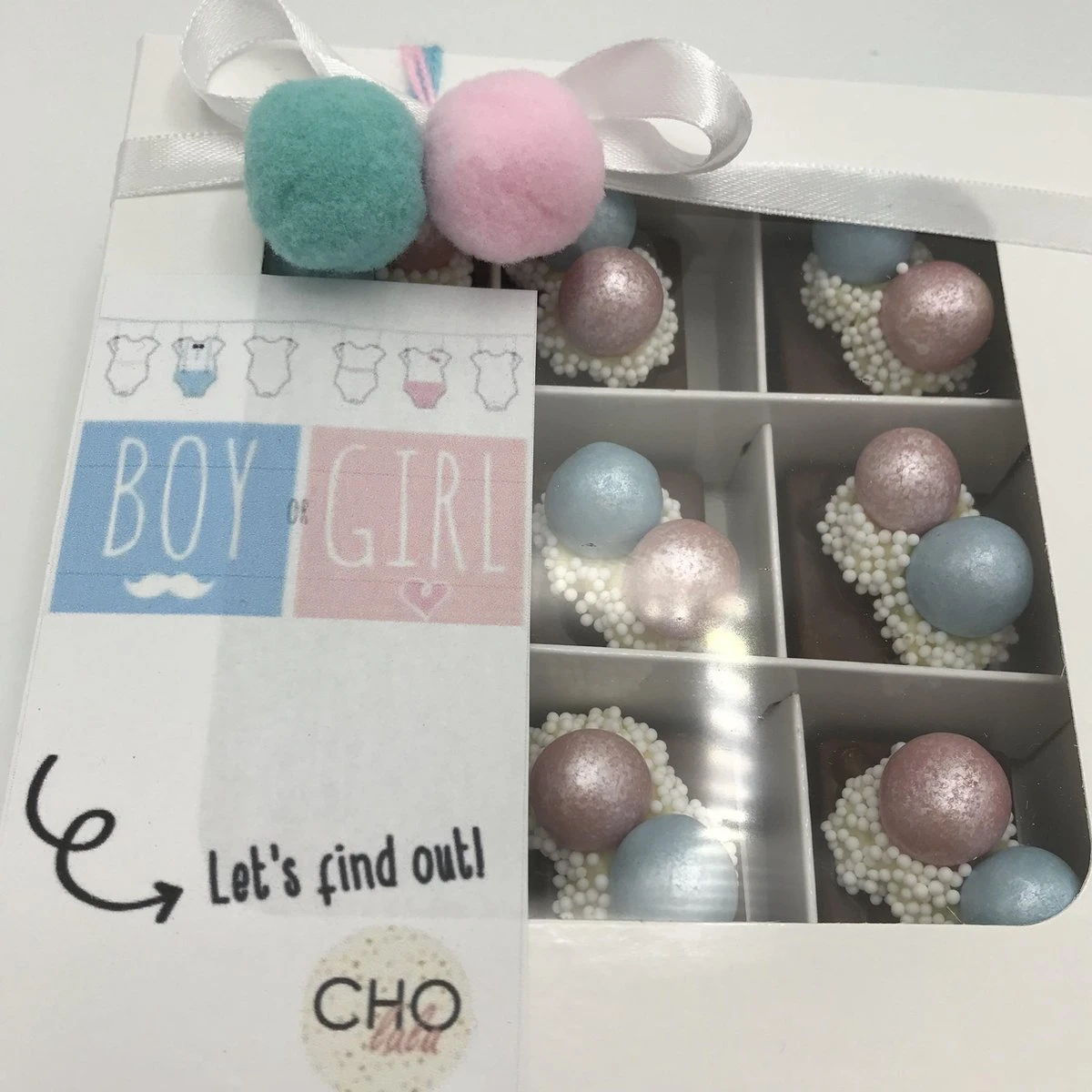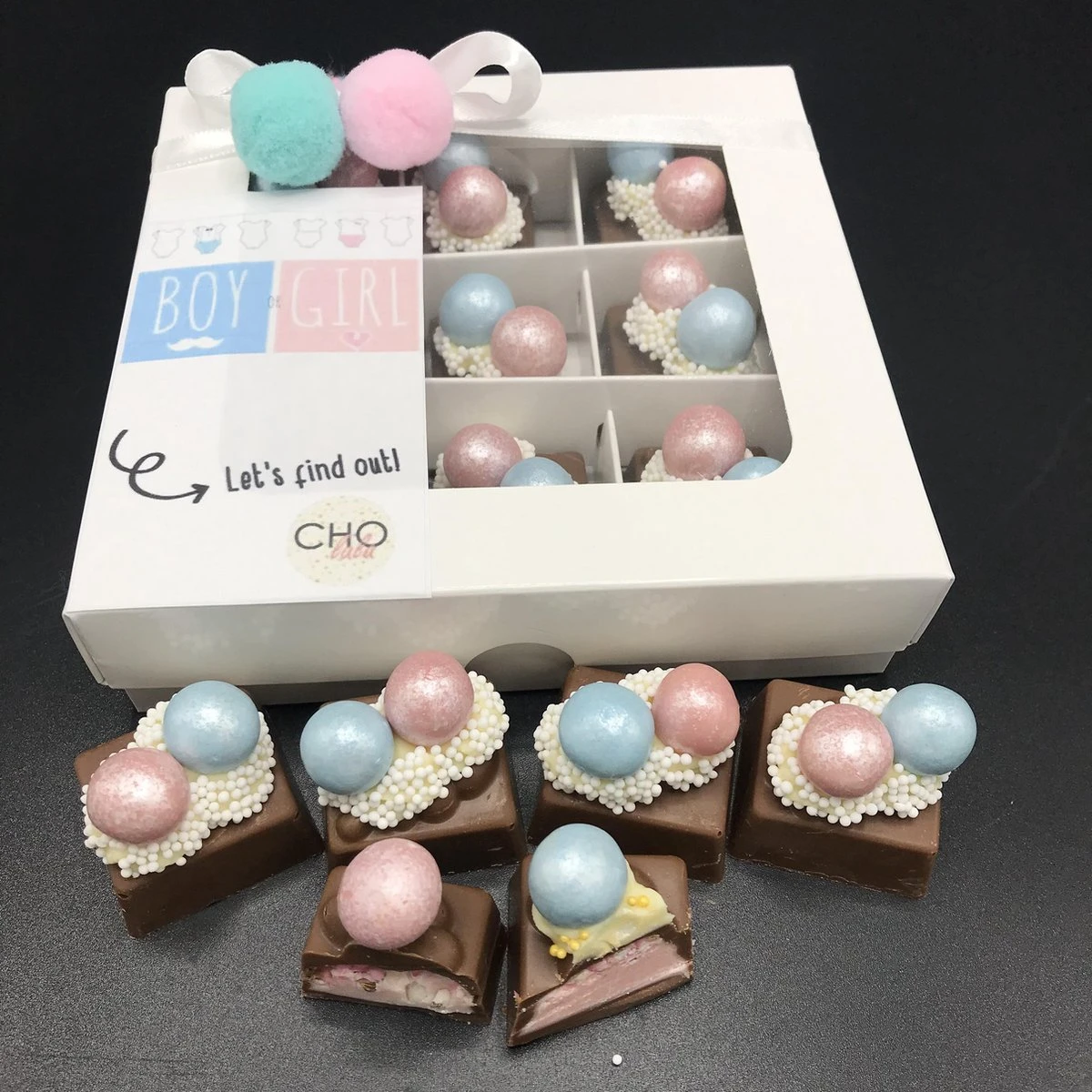 Een mooi doosje van 9 stuks (200 gram) handmade melkchocolade bonbons met een romige babyroze vulling met anijsmuisjes. Dus pas op het moment dat je de bonbon doorbijt, komt de ROZE vulling tevoorschijn. De bonbon is opgemaakt met een roze en blauw bolletje, gemaakt van krokante koek.