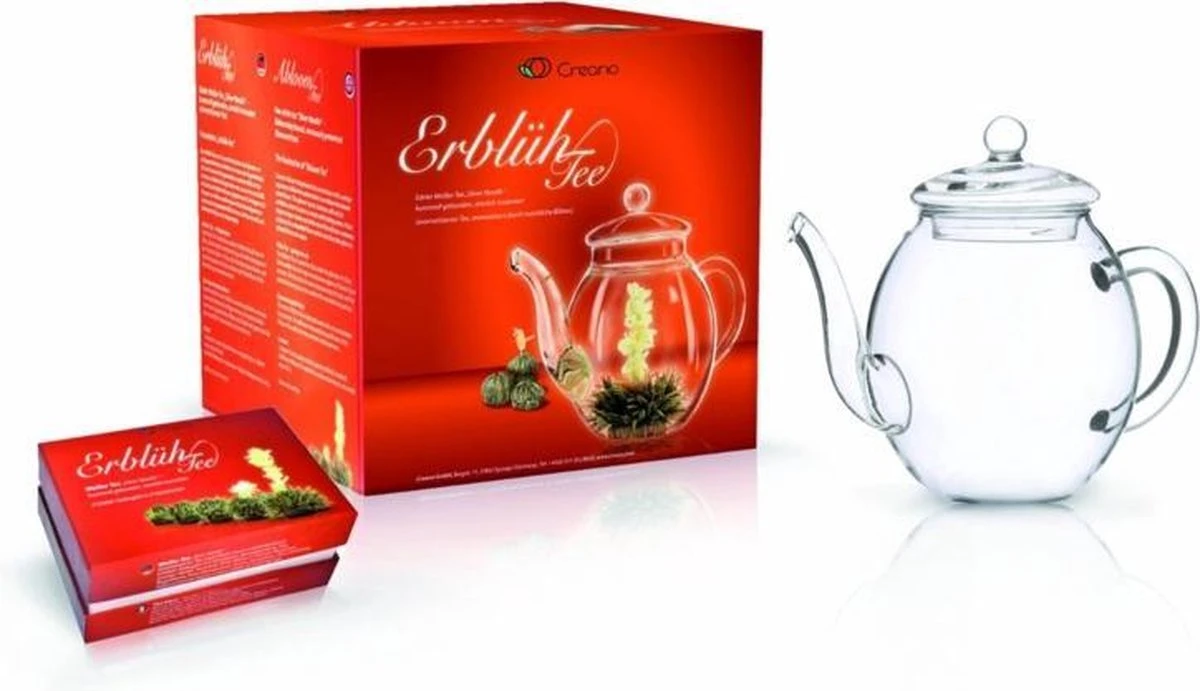 – 6 aromatische variaties van witte thee – Inclusief een hittebestendige glazen kan 0,5 l – In aantrekkelijke geschenkverpakkingen voor echte theeliefhebbers – Elke theebloem kan tot 3 keer worden toegediend voor ongeveer 1,5 liter thee Bijna alles is handgemaakt op deze thee! De bloeiende thee biedt de connaisseur een buitengewone ervaring: in de bal zit een artistiek geïntegreerde, exotische bloesem. De bal zal zijn geheim echter niet onthullen totdat hij in een pot met kokend water is geplaatst. Het begint langzaam te openen en aan het einde van de infusieproductie produceert het de ingebedde bloem, die oprijst in een vorm die rijk en kleurrijk is. Slechts enkele meester bindmiddel in de zogenaamde, is voorbehouden aan de gedroogde bladeren van witte thee binden in een bolvorm, omdat de kennis van deze zeldzame kunst streng wordt bewaakt. Zo blijft de bloeiende thee een waardevolle zeldzaamheid van China. De Creano-glazen theepot is speciaal ontwikkeld voor de traditionele en conventionele theevoorbereiding.
