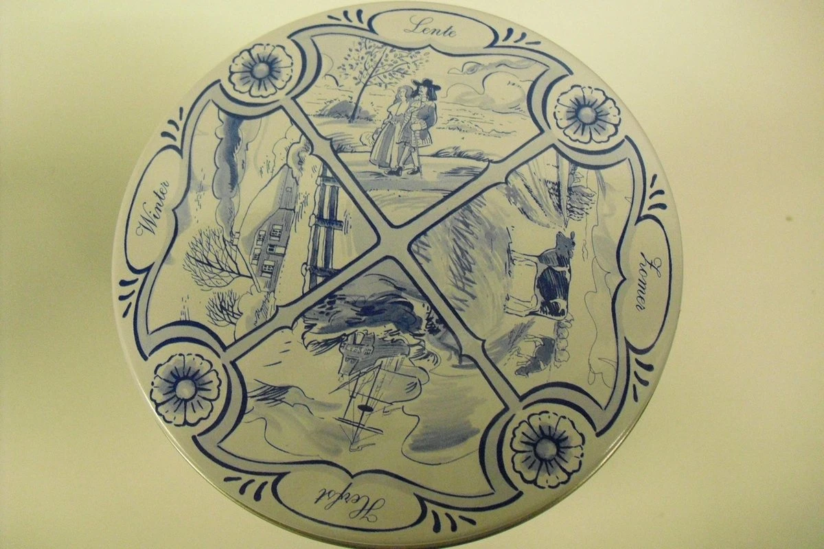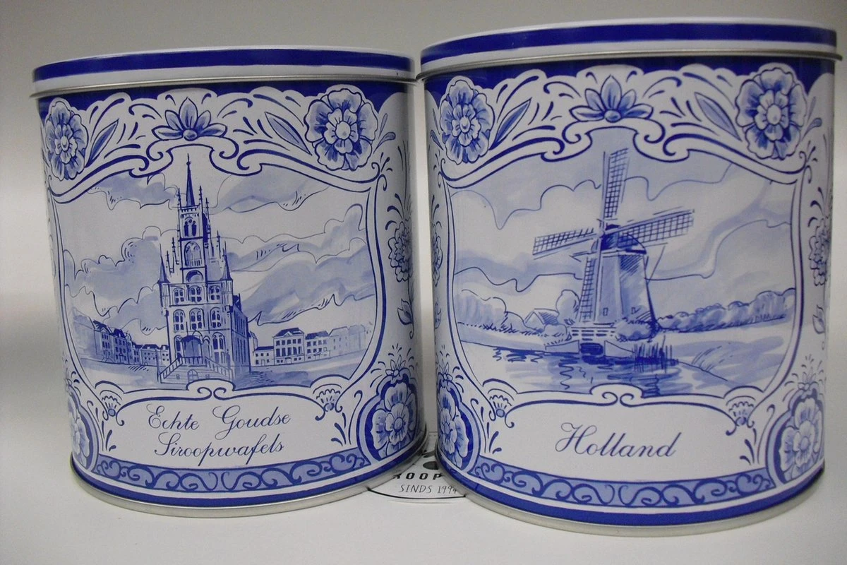 Authentieke stroopwafelblik met oud hollandse taferelen.