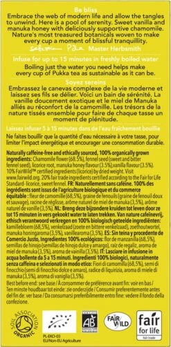 Pukka Chamomile Vanilla & Manuka Honey Thee is een heerlijk smaakvolle thee met kamille, vanille en manuka honing. Pukka thee is 100% biologisch en fairtrade. Eén verpakking bevat 20 theezakjes.