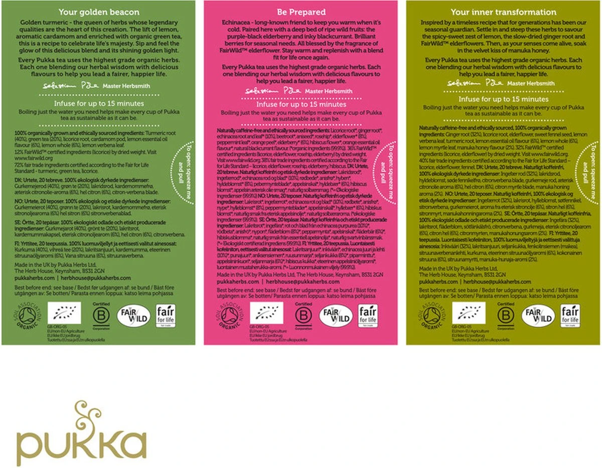 Voel je elk seizoen goed met deze selectie van heerlijke biologische kruidentheeën. Welke smaak je ook kiest, elke blend is deskundig samengesteld om jouw zintuigen te prikkelen en comfort te bieden. De Pukka Support Kruidenthee bundel bevat Lemon, Ginger & manuka, Elderberry & Echinacea en Turmeric gold (20 theezakjes van elke variant). Een bundel vol met krachtige biologische ingrediënten om verwarming te bieden en seizoensgebonden welzijn te ondersteunen. Laat de kruiden tot 15 minuten in vers gekookt water trekken. Door alleen de hoeveelheid water te koken die je nodig hebt, wordt elk kopje Pukka thee zo duurzaam mogelijk.