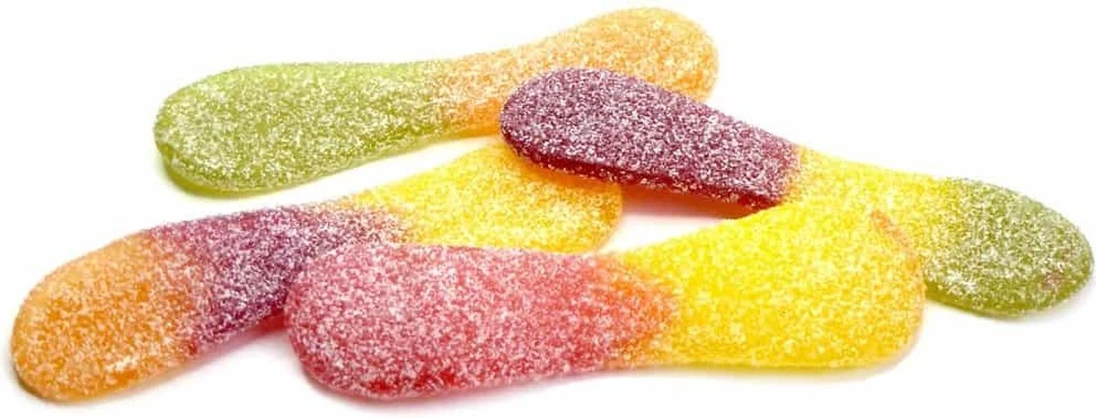 | Ingrediënten | suiker, glucosestroop, gemodificeerd zetmeel, zetmeel, voedingszuren (melkzuur, appelzuur), gelatine, zuurteregelaar (natriummalaten), natuurlijke aroma's, concentraat van (zwarte wortel, spirulina, saffloer, wortel, zwarte bes), kleurstoffen (paprika extract, curcumine). |