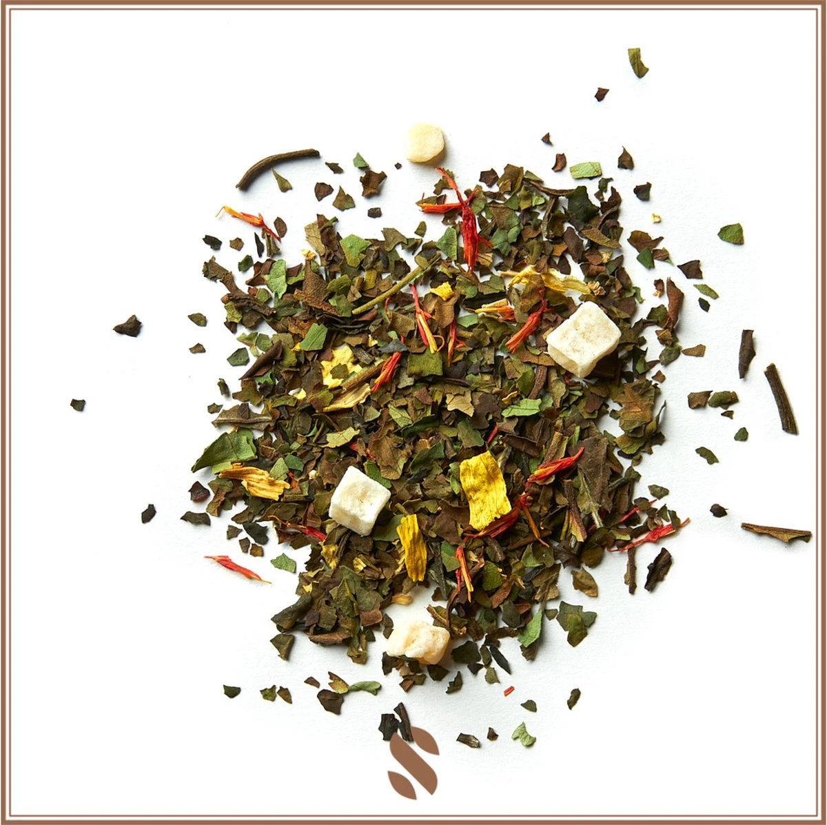 Witte thee 84%, Mangostukjes, Zoete bramenbladeren, Zonnebloemblaadjes, Saffloer bloemen, Natuurlijk mango aroma