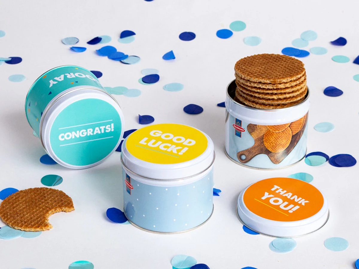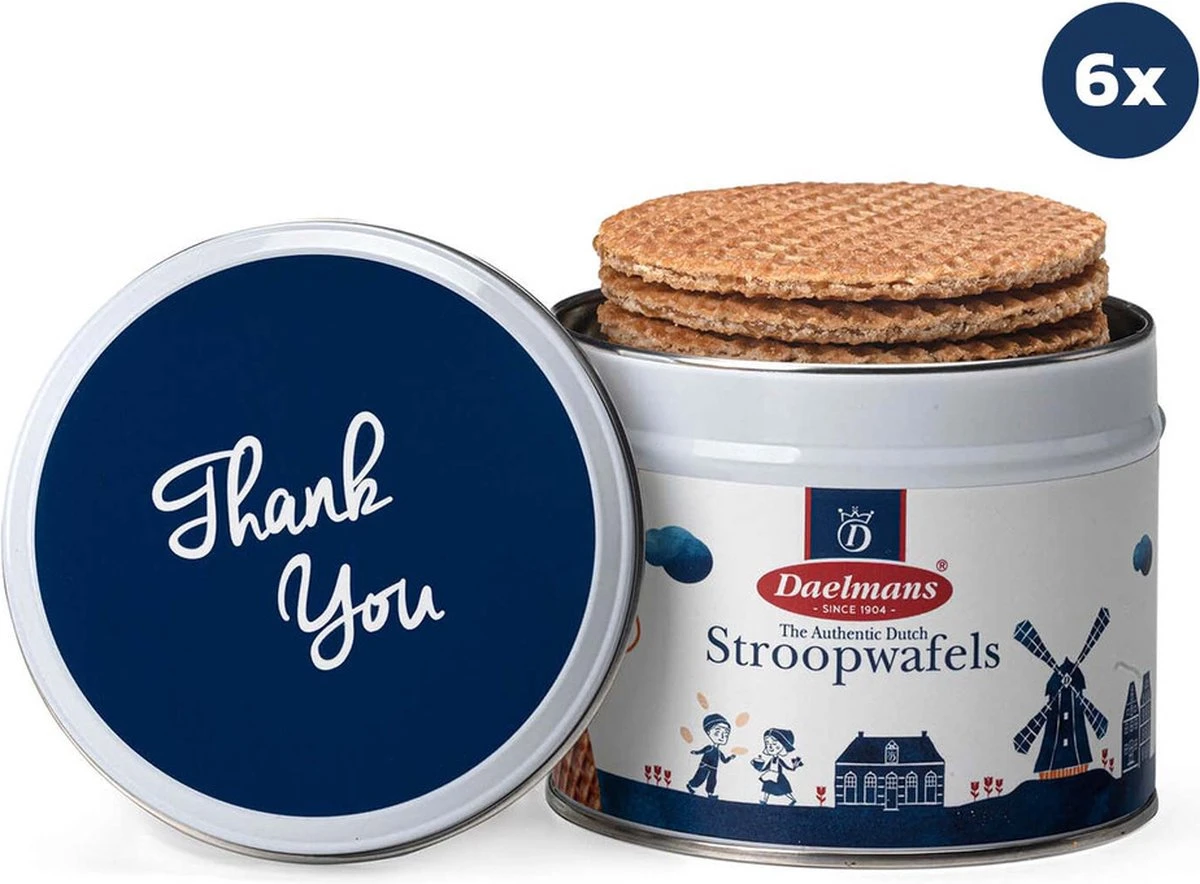 Geef een feestelijk stroopwafelblik aan vrienden of familie wanneer jullie iets met elkaar te vieren hebben. Dan staat er meteen iets lekkers op tafel voor bij de koffie. Uiteraard kun je het blik daarna weer hergebruiken en vullen met nieuwe Stroopwafels. Deze voordeelverpakking bestaat uit 6 blikken.
