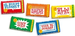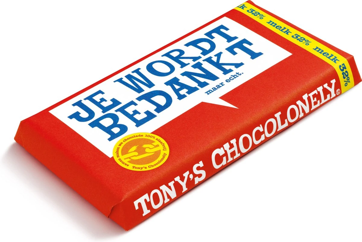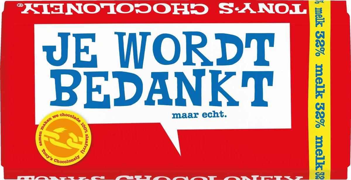 Wat je ook te zeggen hebt, je zegt ’t vanaf nu met een reep. Da’s beter dan een mond vol woorden. Stuur je bestie, je neefje of je collega ’n je wordt bedankt-reep met melkchocolade omdat hij of zij zo lekker bezig is! Maar echt. Voor het zélf maken van je eigen unieke wikkel ga je naar: tonyschocolonely.nl