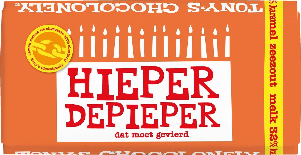 Stuur de hieper de pieper-reep naar je neefje omdat ’ie z’n zwemdiploma heeft gehaald, zijn verjaardag of naar je oma omdat ze iets te vieren heeft. Want dat vraagt om deze feestelijke karamel zeezout reep mét taart én kaarsjes.